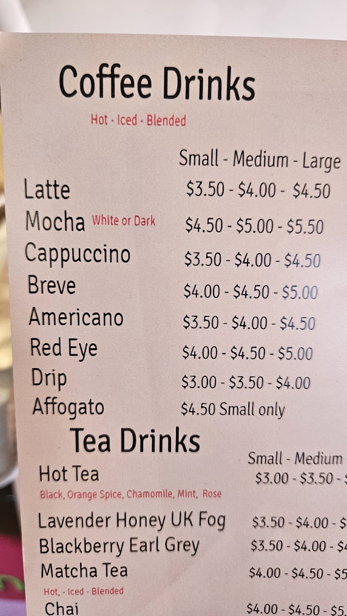 Soda, Flavor, Cream and Whipped Cream 3.50, 4.00, 4.50